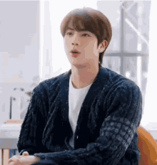 Seokjin looking handsome in a stylish blue patterned cardigan over a white t-shirt, sitting indoors.
