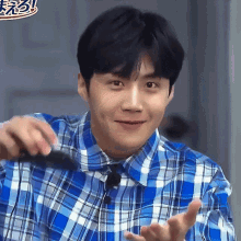 Kim Seon-ho smiles brightly in a blue plaid shirt, holding a small black clapper in his hands.