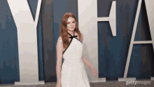 Karen Gillan walks the red carpet at the Vanity Fair Oscars Party in a stunning white halter-neck dress.