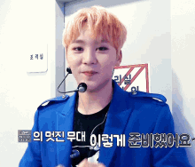 Seungkwan, wearing a blue jacket, smiles and makes a heart gesture with his hands, with Korean text on screen.