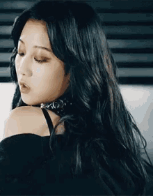 Seungyeon Chang of CLC in a black off-shoulder top and choker, looking over her shoulder.