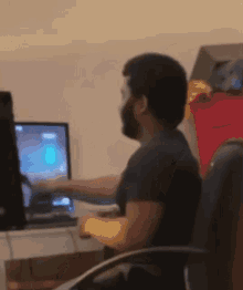 Shakil Darden puts on headphones and reacts while playing a video game on a computer monitor.