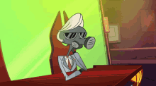 Tom Trench from Vivziepop's Hazbin Hotel shakes his head while sitting at a desk.