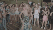 Shakira dancing in a vibrant dress surrounded by a cheering crowd for the 'La Bicicleta' music video.