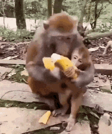 A mother monkey and her baby share a banana, with the mother carefully peeling and feeding the little one.