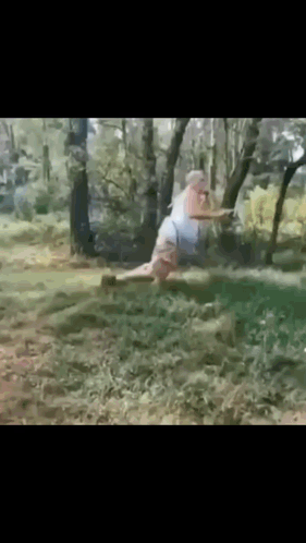 A man, humorously depicted as a 'fairy' or 'grandpa', swings through the woods in a viral meme video.
