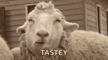 A close-up of a sheep chewing with its eyes closed, accompanied by the text 'TASTEY'.