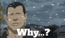 Shenmue character with a sad expression and sparkling tears, asking 'Why...?'