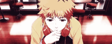 Nagachika Hideyoshi from Tokyo Ghoul, wearing headphones, looks thoughtful in a cafe.