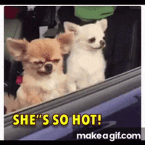 Two chihuahuas in a car, one looking out the window as the other reacts to the text 'SHE'S SO HOT!' with a 'YUP!'.