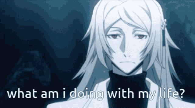 Shibusawa from BSD with long white hair and red eyes, pondering 'what am I doing with my life?'