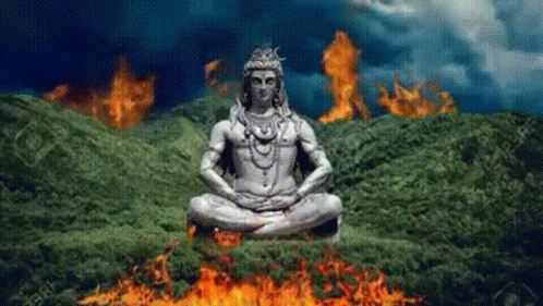 A majestic statue of Lord Shiva, also known as Shivay Dev, meditates in a lotus position surrounded by flames.
