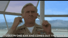 A man in a military uniform humorously demonstrates 'it goes in one ear and comes out the other' from the movie Hot Shots!