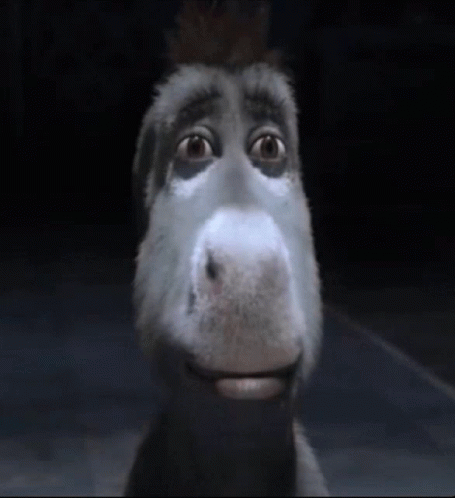 Donkey from Shrek with a mohawk looks directly at the camera, then the scene darkens.