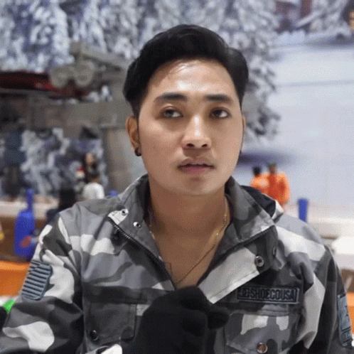 Irwan makes a 'shush' gesture, wearing a camouflage jacket and black gloves, in a winter-themed setting.