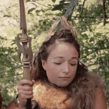 Shura from Desaventureiros in a fantasy costume, holding a spear in a forest setting.
