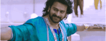 Prabhas, in a blue shirt, smiles shyly with arms outstretched, looking at the camera.