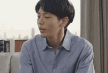 Up Poompat Iamsamang in a blue shirt, looking shyly down and to the side in a contemplative moment.