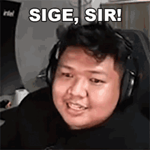 Trinhil, wearing headphones, enthusiastically says 'Sige Sir!' in front of a computer.