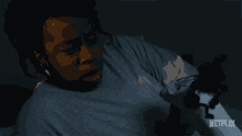 Uzo Aduba as Suzanne from Orange Is The New Black looks scared then relieved in a dimly lit room.
