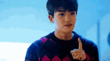 Park Hyung-sik makes a playful finger gesture while wearing a dark sweater with vibrant patterns.