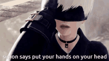 A Nier Automata character, 9S, plays 'Simon Says' by putting hands on head.