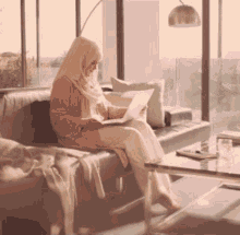 Siti Nurhaliza, wearing a hijab, relaxes on a couch while using her laptop.