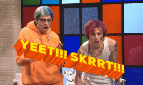 Pete Davidson and Timothée Chalamet perform a mumble rap skit with "YEET!!! SKRRT!!!" text.