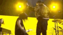 Skrillex and Justin Bieber performing live on stage under bright yellow lights.