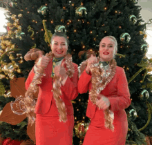 Two women in red outfits give thumbs up in front of a festive Sky Up New Year Christmas tree.