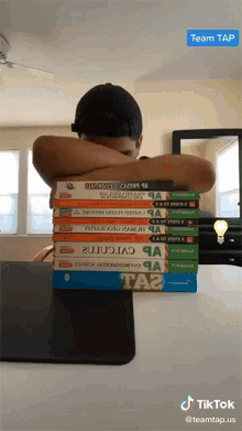 Eric Patel, a student from Team TAP, struggles with homework, resting his head on a stack of AP and SAT textbooks.