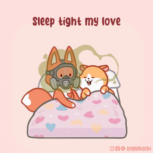 A cute animated fox in a gas mask and a hamster sleeping together under a blanket, with the text 'sleep tight my love'.