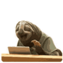 Flash the sloth from Zootopia laughs while looking at a tablet at his office desk.