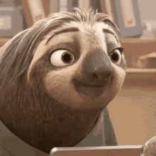 Flash the sloth from Disney's Zootopia slowly smiles, reacting to something on a tablet.