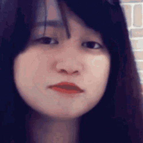 A young woman with dark hair and red lips makes a small hands gesture and laughs playfully.