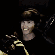 Casey Kirwan smiling brightly while wearing headphones in a dark room, holding a gaming controller.