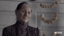 Geraldine James as Marilla Cuthbert smiles gently, with dried fruit garlands hanging in the background.