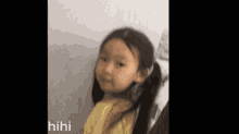 A little girl in a yellow shirt makes a funny face and smiles at the camera, saying 'hihi'.