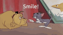 Tom the cat playfully tries to make Spike the bulldog smile by manually pulling up his cheeks.