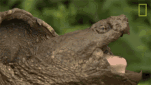 A snapping turtle unexpectedly bites an elephant's trunk in a close-up shot, showcasing a moment of wild nature.