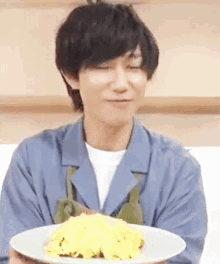 Snow Man member Abe Ryohei, also known as Abe Chan, smiles and gestures while holding a plate of omurice.