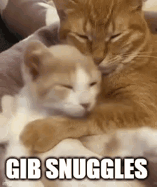 Two adorable cats snuggling closely, one gently licking the other, with the caption 'GIB SNUGGLES'.
