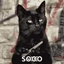 A black cat, possibly Salem, holds a pair of scissors with an intense gaze in front of a brick wall.