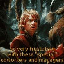 Bilbo Baggins looking frustrated with "special" coworkers and managers, a popular meme.
