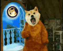 A classic portrait-style painting of Sofakingdoge, the Shiba Inu meme, with its mouth open.