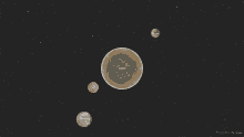 An animation of Jupiter and its Galilean moons (Io, Europa, Ganymede, Callisto) rotating.