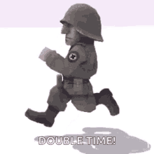 An animated cartoon soldier in uniform marches vigorously as the text 'DOUBLE TIME!' appears on screen.