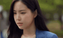 Son Naeun sighs while wearing a blue jacket, captured in a close-up shot.