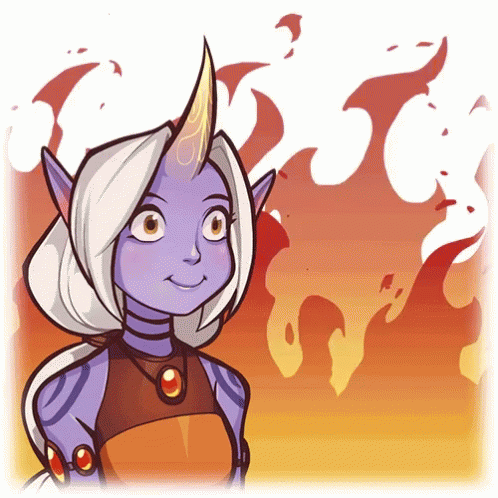 Soraka Fuego, the purple-skinned League of Legends character, smiles with a fiery background.