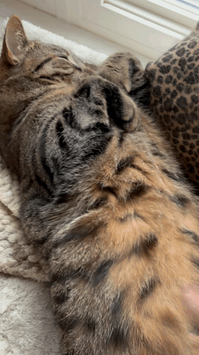 Spazcat, a tabby cat, enjoys a gentle belly rub while sleeping soundly on a soft blanket.